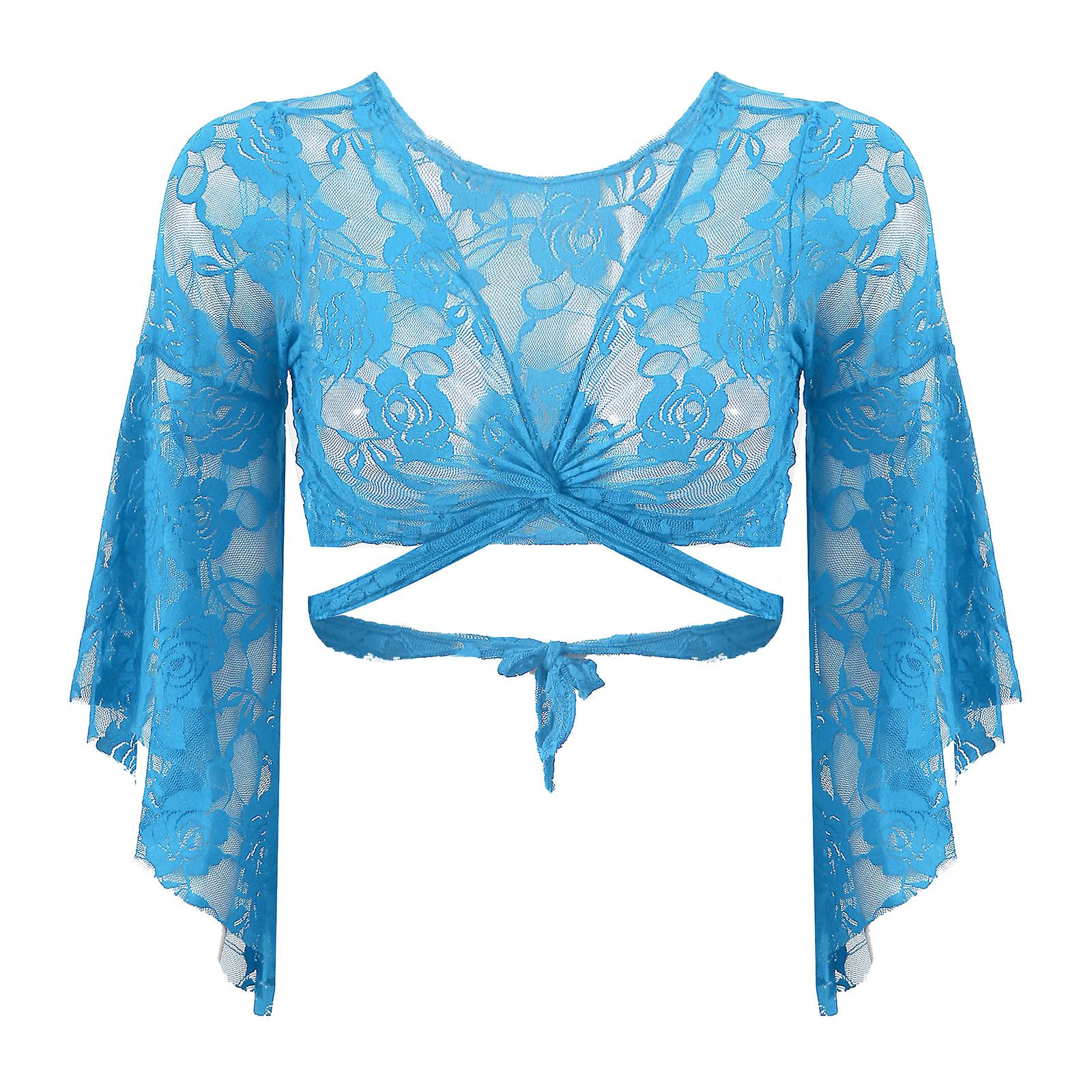 The top is made of completely lace stretch fabric in turquoise with butterfly sleeves