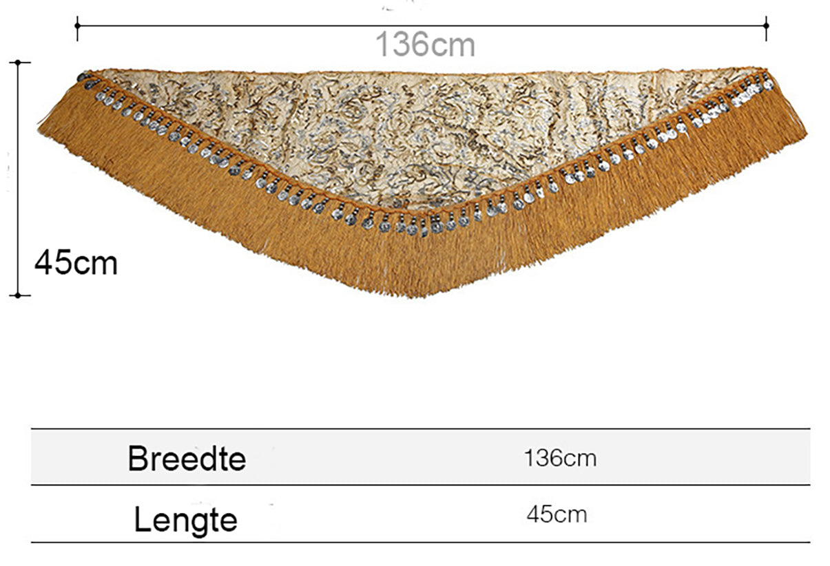 The scarf has a height of 45 cm and a length of 136 cm including the coins. The coin belt can be worn from S to XL, making it suitable for different body types. With this hip scarf you will definitely steal the show during your performances or dance lessons.