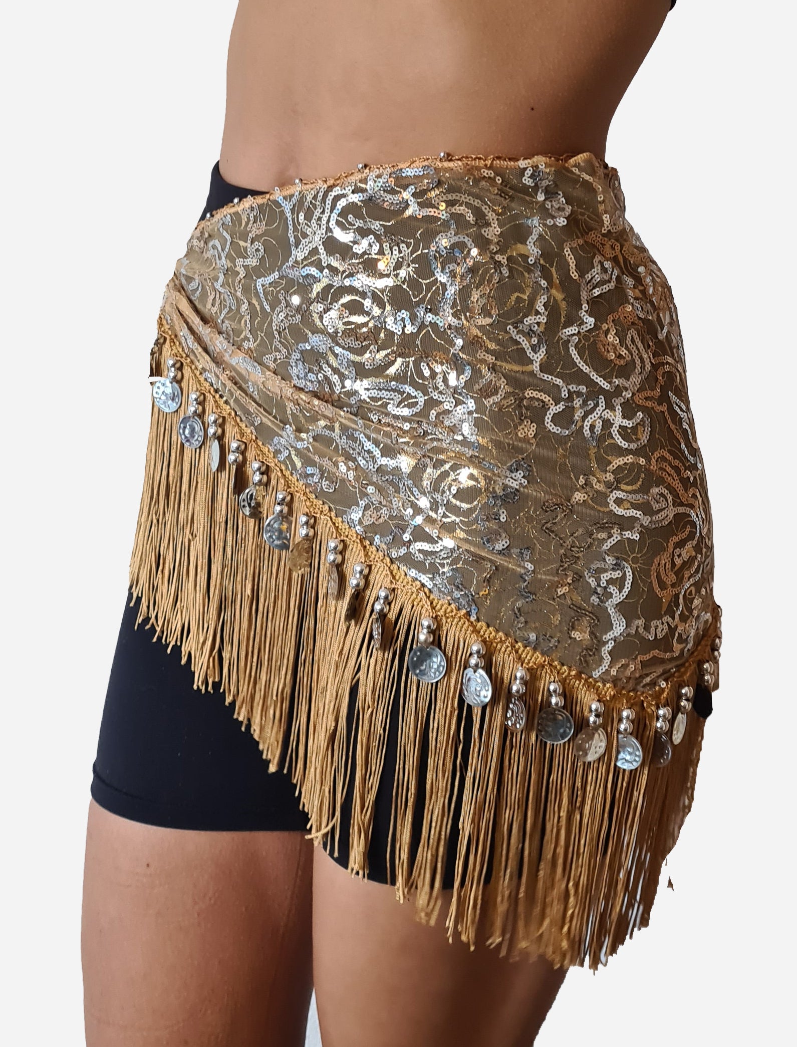This beautiful gold colored belly dance hip scarf with lines of small sequins and silver coins is a perfect addition to your belly dance outfit.