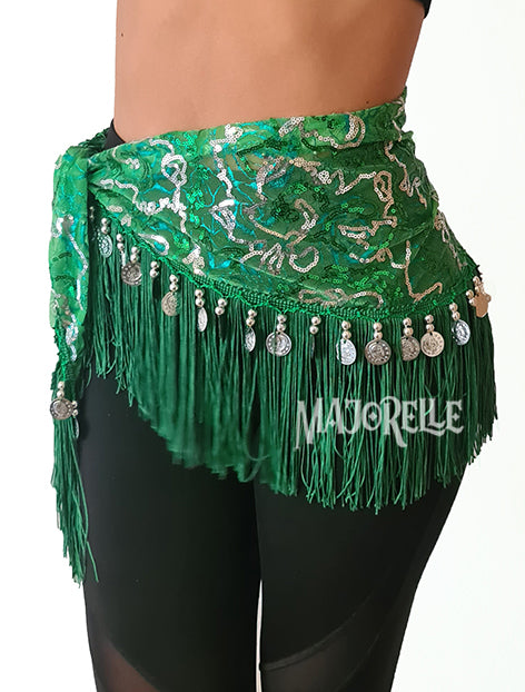 This beautiful fuchsia pink hip scarf with silver lines and silver coins is a perfect addition to your bellydance outfit. The scarf has a height of 45 cm and a length of 136 cm including the coins.