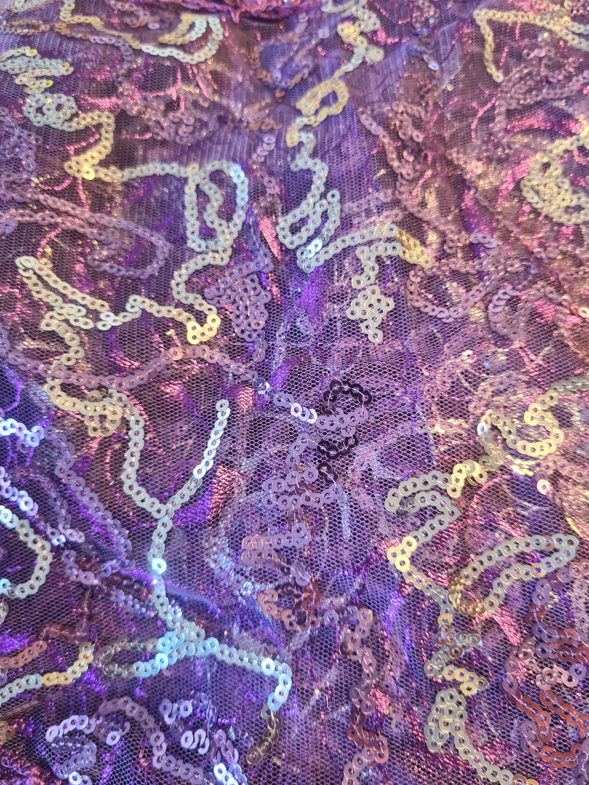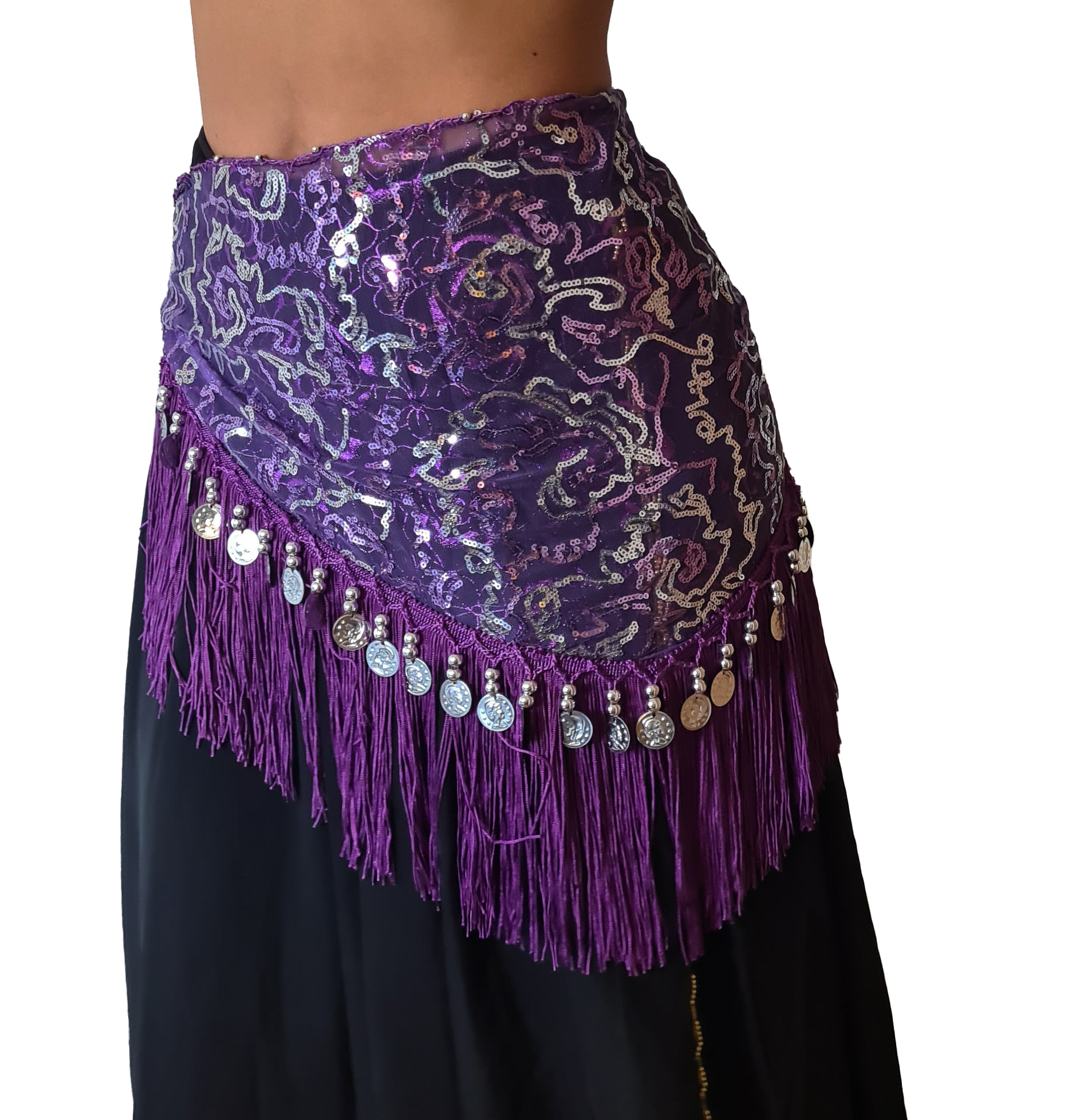 This beautiful purple belly dance hip scarf with lines of small sequins and silver coins is a perfect addition to your belly dance outfit.