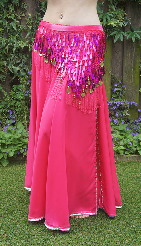 Belly dance skirt fuchsia with slit, finished with silver beads.