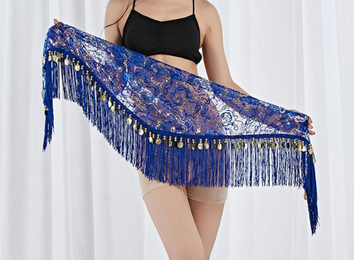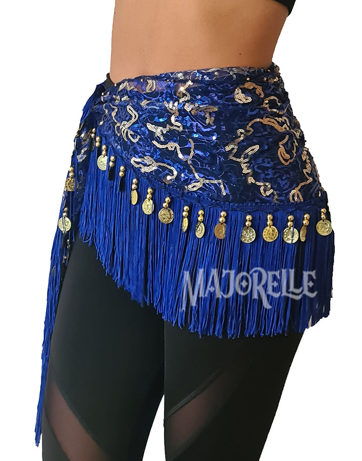 This beautiful black belly dance hip scarf with lines of small sequins and gold coins is a perfect addition to your belly dance outfit.