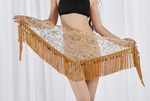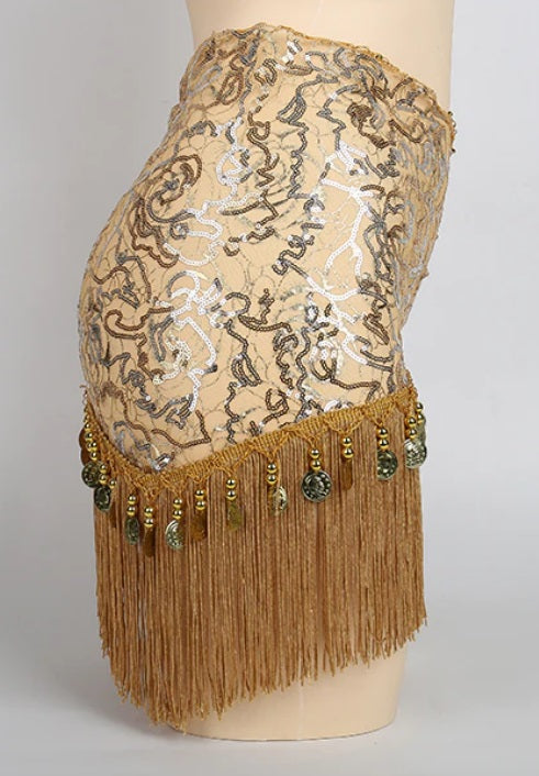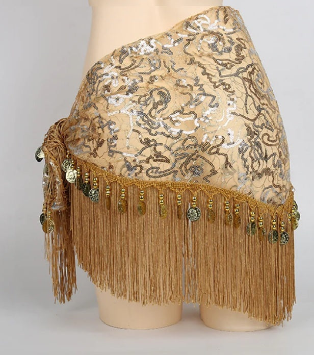 This beautiful gold colored belly dance hip scarf with lines of small sequins and gold coins is a perfect addition to your belly dance outfit.