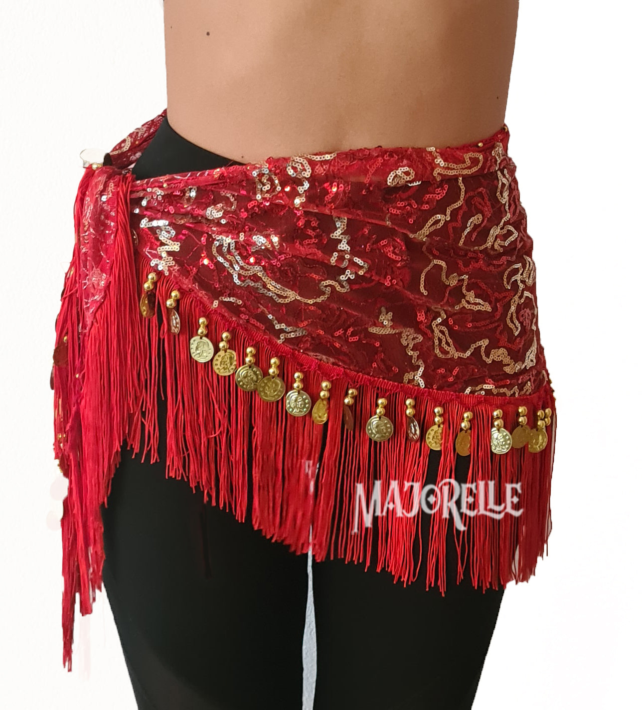 The scarf has a height of 45 cm and a length of 136 cm including the coins. The coin belt can be worn from S to XL, making it suitable for different body types. With this hip scarf you will definitely steal the show during your performances or dance lessons.