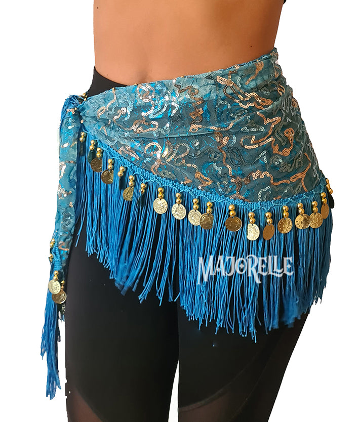This beautiful black belly dance hip scarf with lines of small sequins and gold coins is a perfect addition to your belly dance outfit.