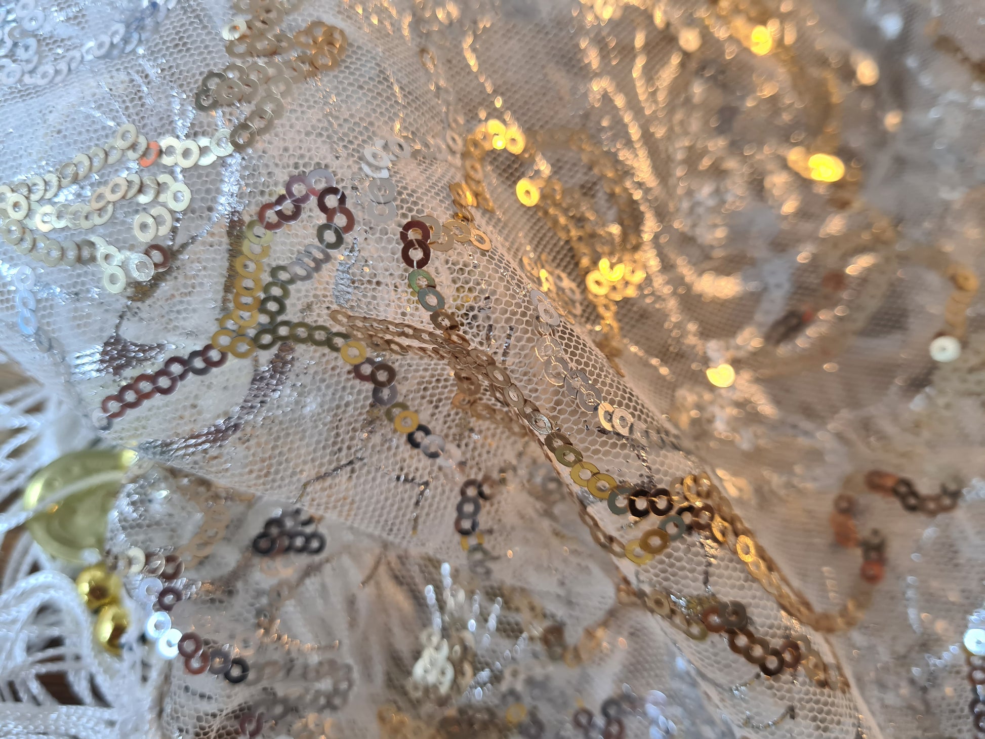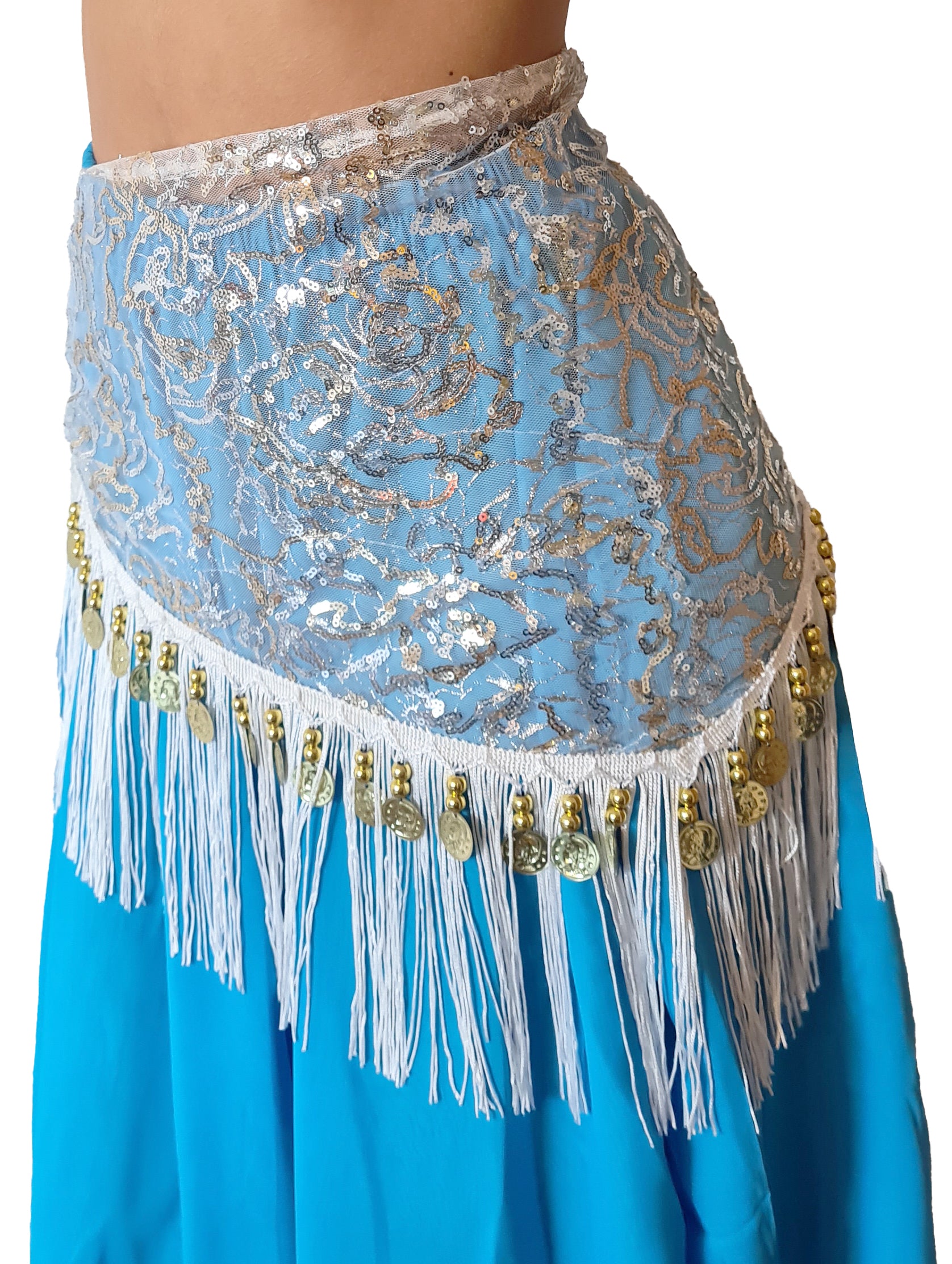 The scarf has a height of 45 cm and a length of 136 cm including the coins. The coin belt can be worn from S to XL, making it suitable for different body types. With this hip scarf you will definitely steal the show during your performances or dance lessons.