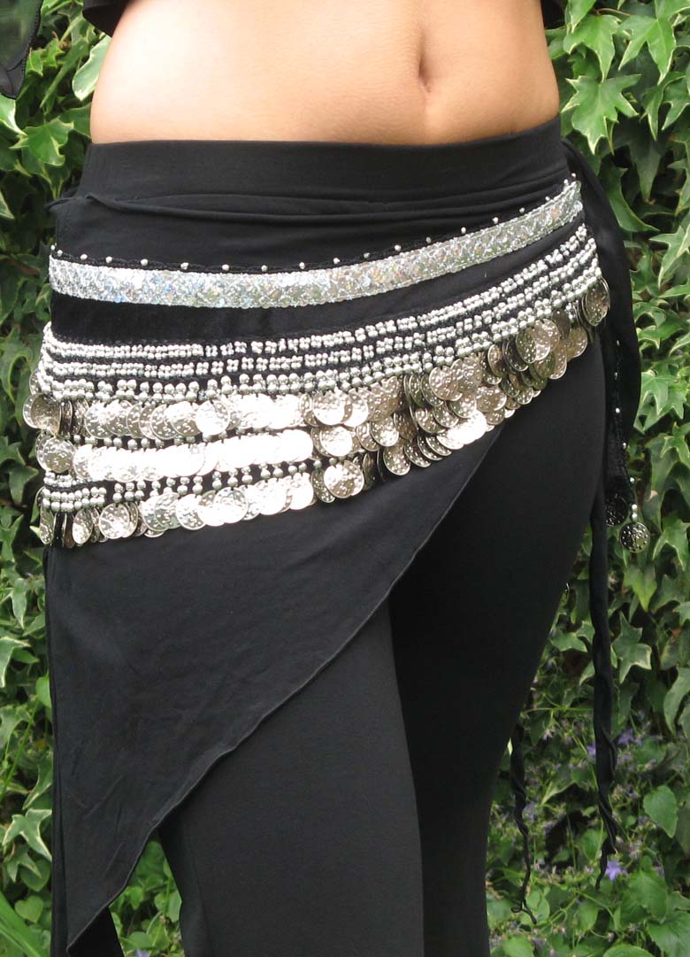Beautiful scarf with 3 rows of silver-colored coins and a silver-colored band. Worked part 75 cm long, total length of scarf incl. knotting part 125 cm