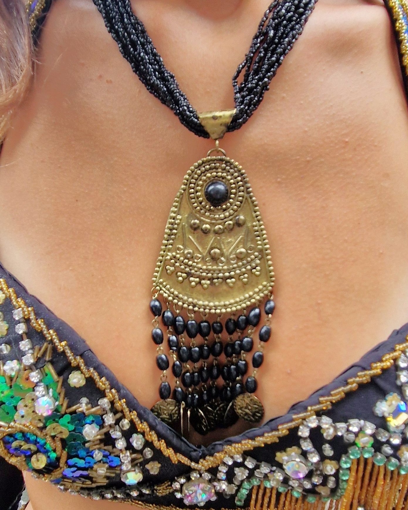 Necklace with many beads, a gold-colored amulet and matching earrings