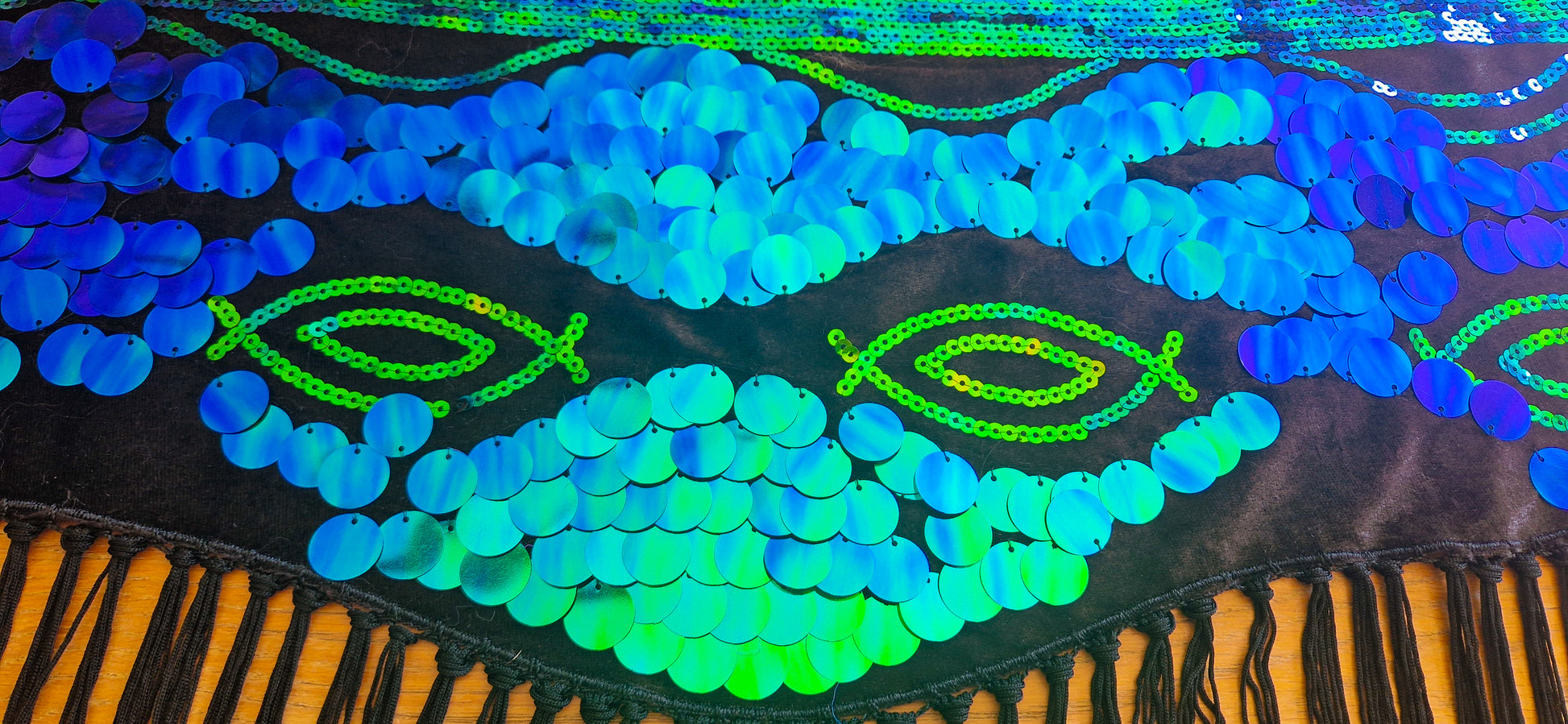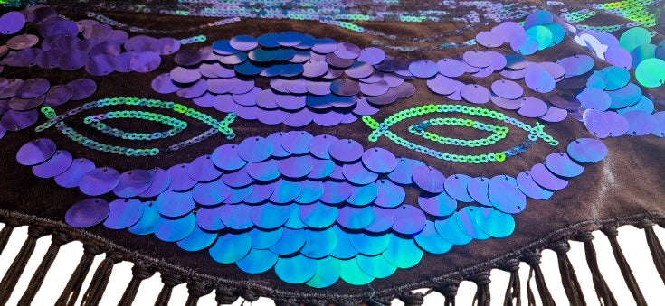 Beautiful hip scarf in turquoise, with sequins and flowers.