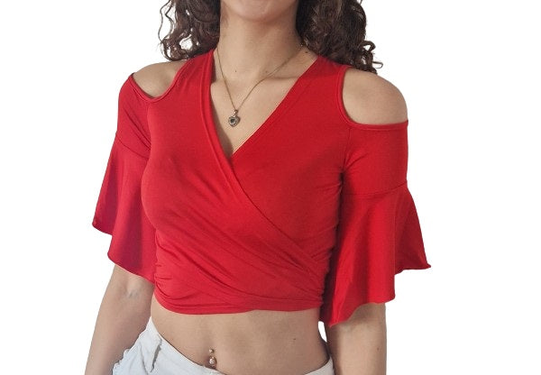 This cute red crop top / tie top with open shoulders is a must-have for every wardrobe. Perfect for belly dancing or just to wear as is. Available in different colors. Made of milk silk, a stretchy fabric that is wonderfully comfortable to wear