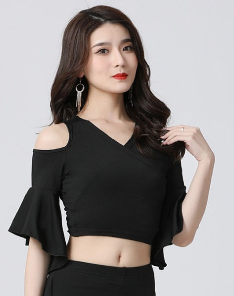 This cute black crop top / tie top with open shoulders is a must-have for every wardrobe. Perfect for belly dancing or just to wear as is. Available in different colors. The milk silk fabric is stretchy and very comfortable to wear